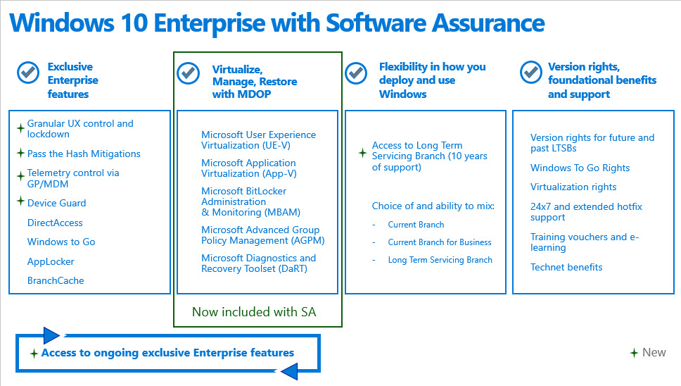 As I mentioned in a previous post, with the Windows 10 launch, MDOP is now included as an SA benefit, and is no longer a separate add-on.  This post explains Windows 10 Enterprise features with Software Assurance