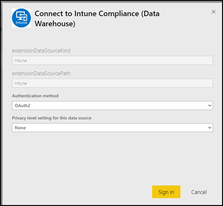 - Once connected, you can click the Intune Compliance (Data Warehouse) in the left Navigation pane.