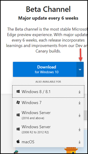 When you launch the site, the default download and the most stable release is the Beta Channel (#1 in the screenshot below). If you would like to try more up to date and frequent Channels update, as Microsoft develops then choose the More platforms and channels link on the site (#2 in the screenshot below). This link will give you access to a Dev Channel which is updated weekly and the Canary Channel which is updated daily. The Canary channel is usually released right after Microsoft updates the code, which is why it is called a Canary build. In the old mining days, a canary would be sent into a coal mine to check for deadly gas.